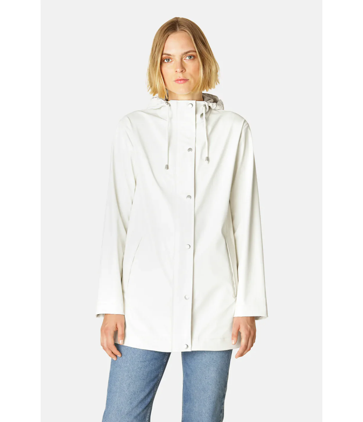 This new contemporary wardrobe staple is a straight-fit raincoat in durable lightweight-wearing rubberized PU coated waterproof fabric. Expertly made, it’s tailored with welded seams for complete protection against the rain and with a recycled tricot backside for comfort. The drawstring hood with string in cotton look and under-arm eyelets add ease of movement and comfort in uncomfortable weather. This quality offers weather protection with a waterproof rating of 5000 mm.