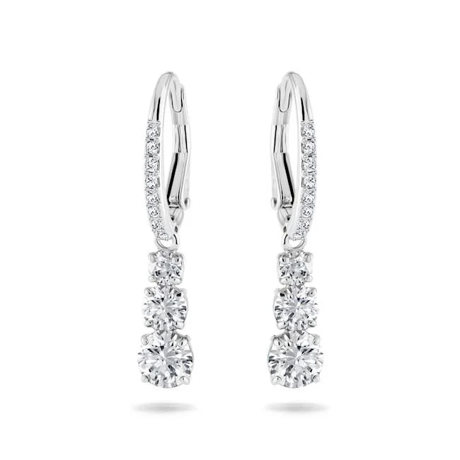 By its very nature eternal love must have a past, a present, and a future, and this pair of stunning pierced earrings has been conceived with that romantic concept in mind. A trio of clear crystals are embellished with pavé and rhodium plating in this scintillating design. Timelessly elegant, they will be a treasured keepsake. A matching necklace and ring are available.